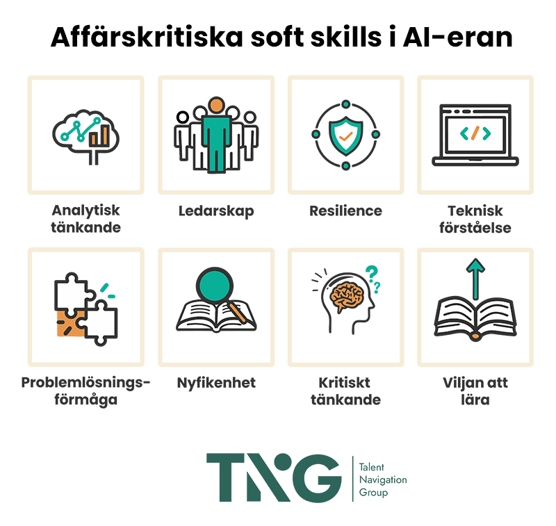 World Economic Forums syn pekar åt samma håll. De har listat vilka färdigheter som krävs för att lyckas 2030. På listan finns hårda skills men övervägande lyfter de fram soft skills som teknisk läskunnighet, kreativt tänkande, flexibilitet, nyfikenhet och viljan att lära. Dessutom kommer ledarskap inom förändring framåt spela en viktig roll för att lyckas ställa om i AI-eran.